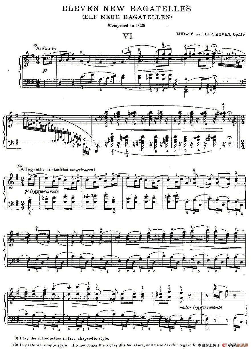 温馨提示:想要保存贝多芬钢琴小品Op.119之六,展现独特音乐魅力曲谱?在曲谱图片上单击右键,选择"图片另存为...",即可将该曲谱保存到您的电脑本地,想要打印出来?将图片插入到WORD中,调整合适到大小打印即可。
