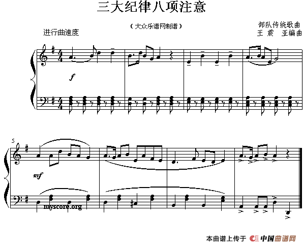 温馨提示:想要保存三大纪律八项注意钢琴谱,经典红歌永流传曲谱?在曲谱图片上单击右键,选择"图片另存为...",即可将该曲谱保存到您的电脑本地,想要打印出来?将图片插入到WORD中,调整合适到大小打印即可。
