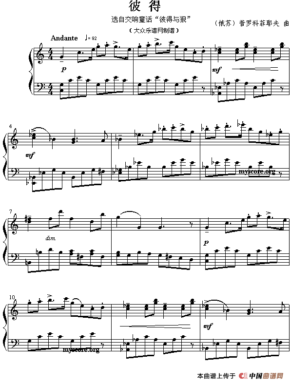 温馨提示:想要保存彼得(交响童话选曲),展现独特音乐意境曲谱?在曲谱图片上单击右键,选择"图片另存为...",即可将该曲谱保存到您的电脑本地,想要打印出来?将图片插入到WORD中,调整合适到大小打印即可。