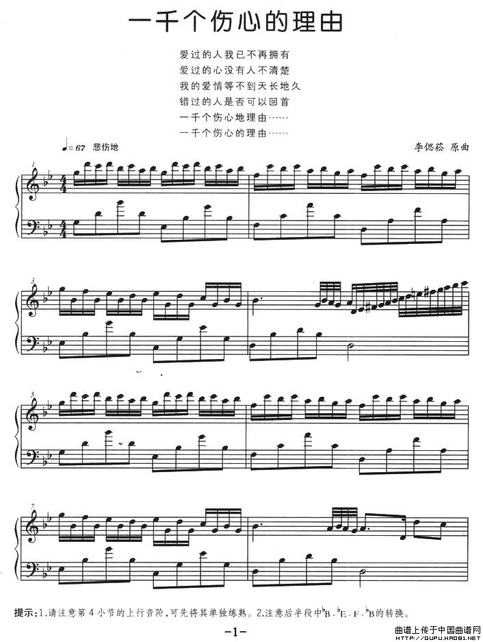 温馨提示:想要保存《一千个伤心的理由》钢琴谱,张学友经典催泪情歌 《离人》钢琴谱,周传雄凄美之作 《贝加尔湖畔》钢琴谱,李健浪漫抒情曲 《传奇》钢琴谱,王菲空灵代表作 《凉凉》钢琴谱,张碧晨悲伤旋律 《时间煮雨》钢琴谱曲谱?在曲谱图片上单击右键,选择"图片另存为...",即可将该曲谱保存到您的电脑本地,想要打印出来?将图片插入到WORD中,调整合适到大小打印即可。