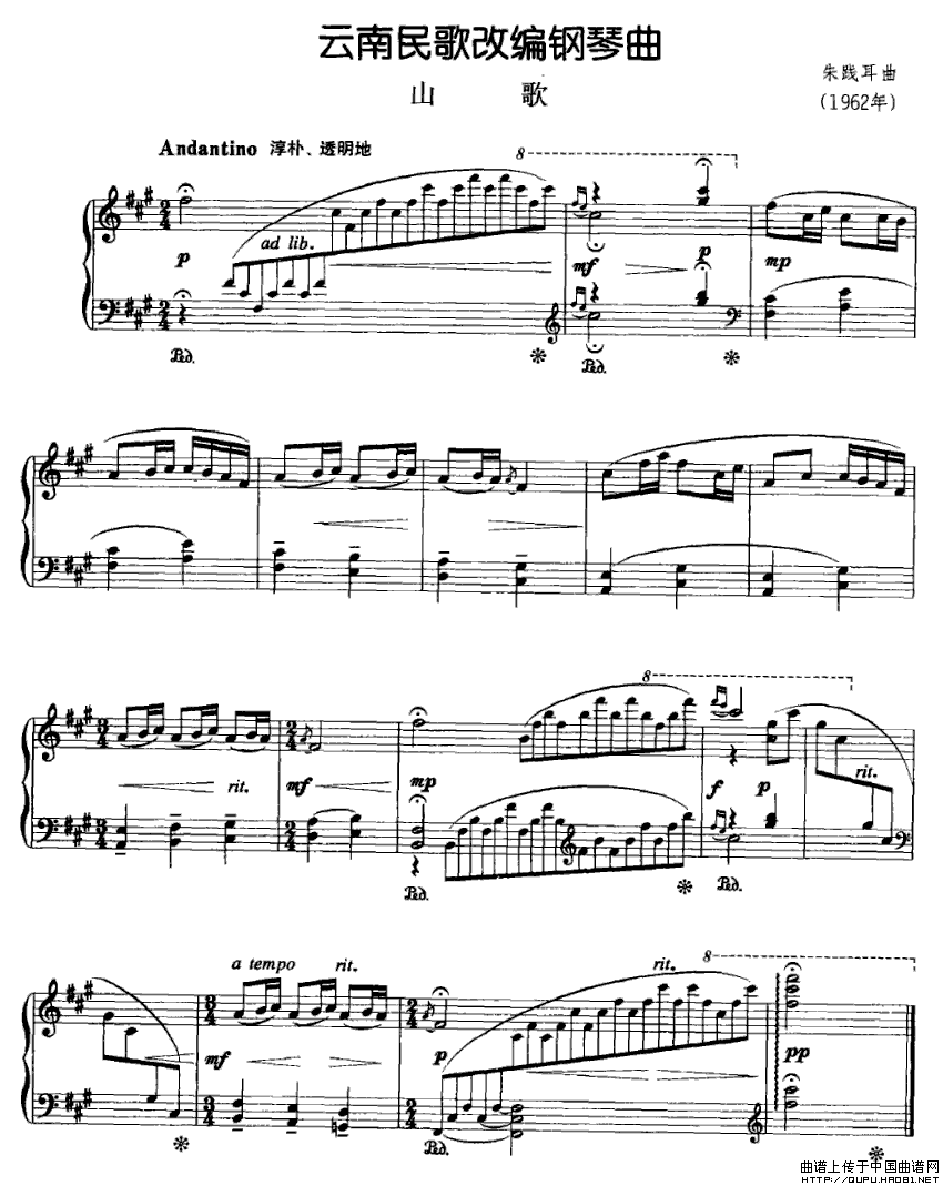温馨提示:想要保存云南民歌改编钢琴曲:山歌,尽显云南民歌风情曲谱?在曲谱图片上单击右键,选择"图片另存为...",即可将该曲谱保存到您的电脑本地,想要打印出来?将图片插入到WORD中,调整合适到大小打印即可。