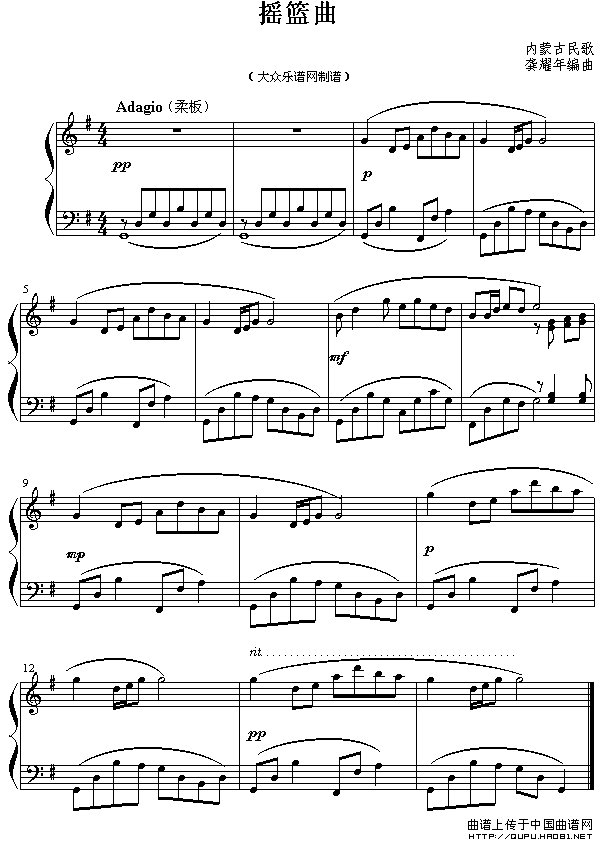 温馨提示:想要保存摇篮曲(内蒙古民歌),舒缓静谧的曲调曲谱?在曲谱图片上单击右键,选择"图片另存为...",即可将该曲谱保存到您的电脑本地,想要打印出来?将图片插入到WORD中,调整合适到大小打印即可。