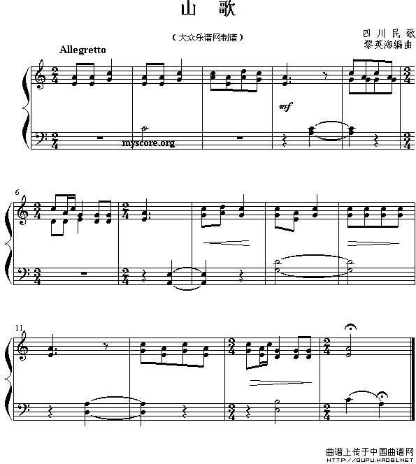 温馨提示:想要保存山歌(四川民歌)钢琴谱,展现四川民歌魅力曲谱?在曲谱图片上单击右键,选择"图片另存为...",即可将该曲谱保存到您的电脑本地,想要打印出来?将图片插入到WORD中,调整合适到大小打印即可。