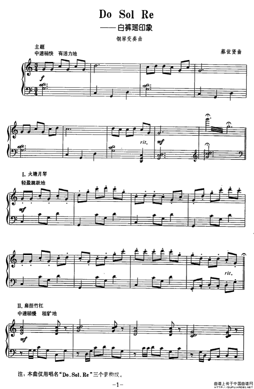 温馨提示:想要保存DoSolRe——白裤瑶印象,展现独特民族风情曲谱?在曲谱图片上单击右键,选择"图片另存为...",即可将该曲谱保存到您的电脑本地,想要打印出来?将图片插入到WORD中,调整合适到大小打印即可。