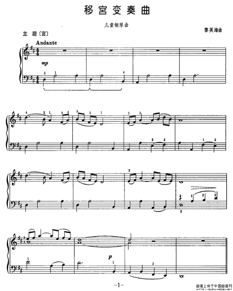 温馨提示:想要保存移宫变奏曲(儿童钢琴曲),独特儿童钢琴乐章曲谱?在曲谱图片上单击右键,选择"图片另存为...",即可将该曲谱保存到您的电脑本地,想要打印出来?将图片插入到WORD中,调整合适到大小打印即可。