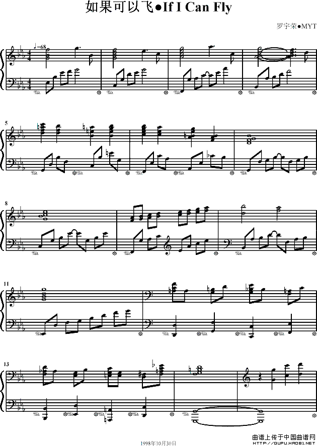 温馨提示:想要保存如果可以飞钢琴谱,歌曲旋律动人心弦 IfICanFly钢琴谱,充满奇幻浪漫氛围曲谱?在曲谱图片上单击右键,选择"图片另存为...",即可将该曲谱保存到您的电脑本地,想要打印出来?将图片插入到WORD中,调整合适到大小打印即可。