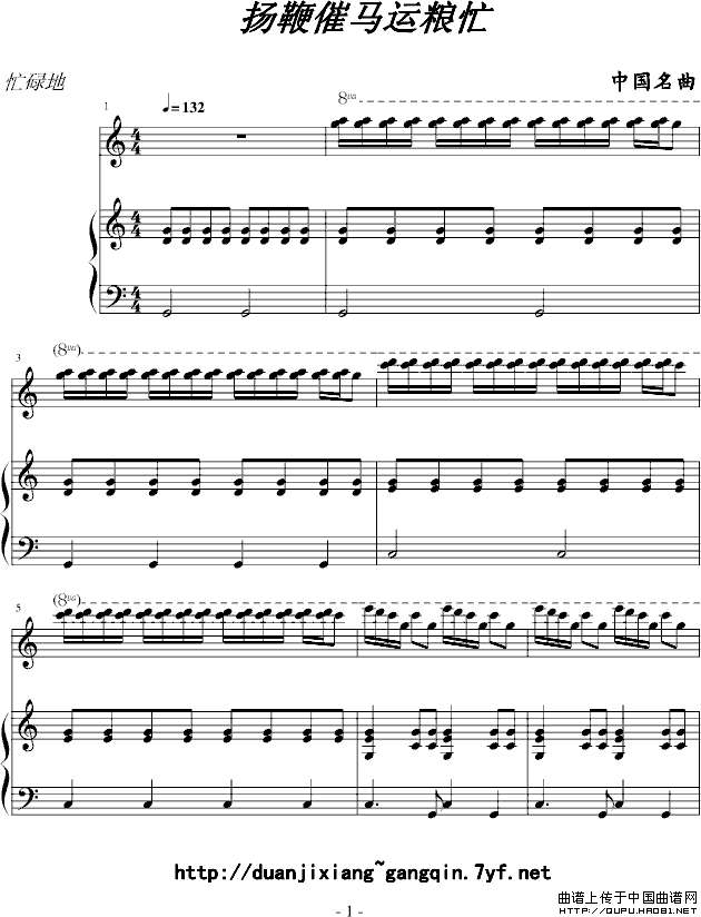 温馨提示:想要保存扬鞭催马运粮忙,欢快的运粮曲曲谱?在曲谱图片上单击右键,选择"图片另存为...",即可将该曲谱保存到您的电脑本地,想要打印出来?将图片插入到WORD中,调整合适到大小打印即可。