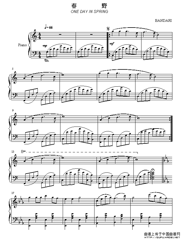 温馨提示:想要保存春野钢琴谱,治愈心灵的旋律曲谱?在曲谱图片上单击右键,选择"图片另存为...",即可将该曲谱保存到您的电脑本地,想要打印出来?将图片插入到WORD中,调整合适到大小打印即可。