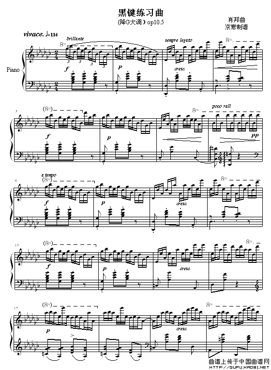 温馨提示:想要保存黑键练习曲,独特风格尽显 黑键练习曲,弹奏别样旋律 黑键练习曲,展现精湛技艺曲谱?在曲谱图片上单击右键,选择"图片另存为...",即可将该曲谱保存到您的电脑本地,想要打印出来?将图片插入到WORD中,调整合适到大小打印即可。