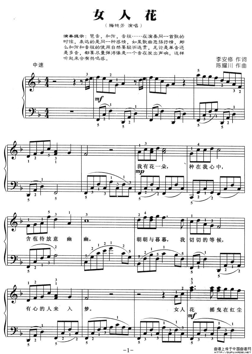 温馨提示:想要保存女人花弹唱谱,经典歌曲韵味足 女人花钢琴谱,柔美旋律诉衷肠 女人花弹唱简谱,细腻情感扣心弦曲谱?在曲谱图片上单击右键,选择"图片另存为...",即可将该曲谱保存到您的电脑本地,想要打印出来?将图片插入到WORD中,调整合适到大小打印即可。