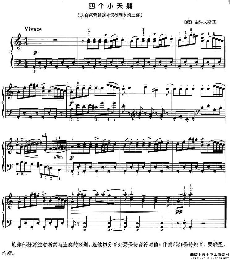 《四只小天鹅》是一首经典的芭蕾舞音乐。其旋律轻快活泼,节奏鲜明跳跃。乐曲以简单而美妙的音符,生动地勾勒出小天鹅们灵动的舞姿。那欢快的曲调仿佛带着听众置身于一场精彩的芭蕾舞表演之中,能深切感受到小天鹅们的俏皮与活力。每一个音符的流淌都好似小天鹅们在翩翩起舞,它们的姿态优雅,动作整齐划一,传递出一种纯真与美好。这首曲子充满了生机与童趣,让人听后心情愉悦,仿佛忘却一切烦恼,沉浸在这欢快的旋律海洋里。