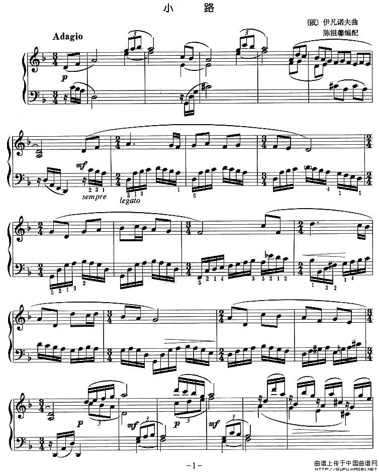 温馨提示:想要保存小路钢琴谱,悠扬曲调诉衷情曲谱?在曲谱图片上单击右键,选择"图片另存为...",即可将该曲谱保存到您的电脑本地,想要打印出来?将图片插入到WORD中,调整合适到大小打印即可。