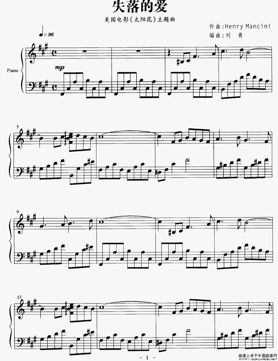 温馨提示:想要保存失落的爱,诠释电影温情,曲谱?在曲谱图片上单击右键,选择"图片另存为...",即可将该曲谱保存到您的电脑本地,想要打印出来?将图片插入到WORD中,调整合适到大小打印即可。