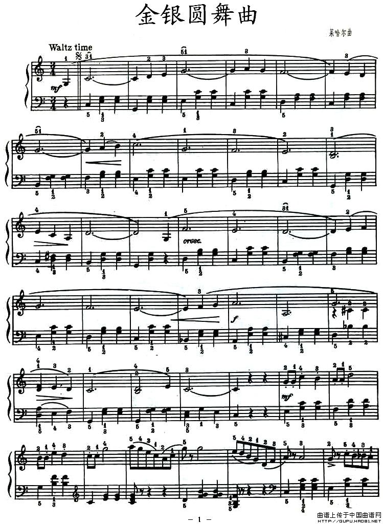 温馨提示:想要保存金银圆舞曲,轻快浪漫旋律曲谱?在曲谱图片上单击右键,选择"图片另存为...",即可将该曲谱保存到您的电脑本地,想要打印出来?将图片插入到WORD中,调整合适到大小打印即可。