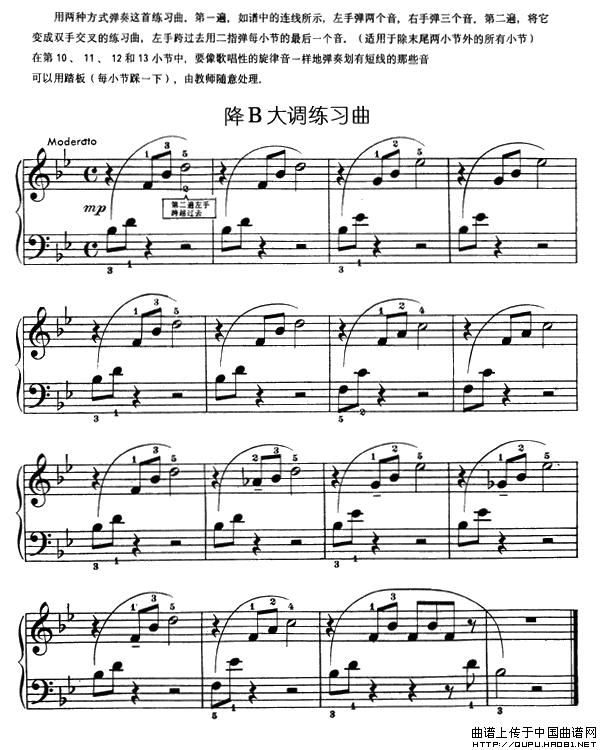 温馨提示:想要保存降B大调练习曲,经典钢琴练习曲 曲谱?在曲谱图片上单击右键,选择"图片另存为...",即可将该曲谱保存到您的电脑本地,想要打印出来?将图片插入到WORD中,调整合适到大小打印即可。