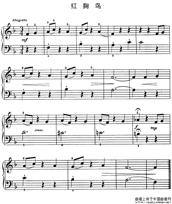 温馨提示:想要保存《红胸鸟》钢琴谱,灵动旋律引共鸣 《红胸鸟》钢琴谱,婉转歌声诉深情 《红胸鸟》钢琴谱,美妙音符绘意境曲谱?在曲谱图片上单击右键,选择"图片另存为...",即可将该曲谱保存到您的电脑本地,想要打印出来?将图片插入到WORD中,调整合适到大小打印即可。