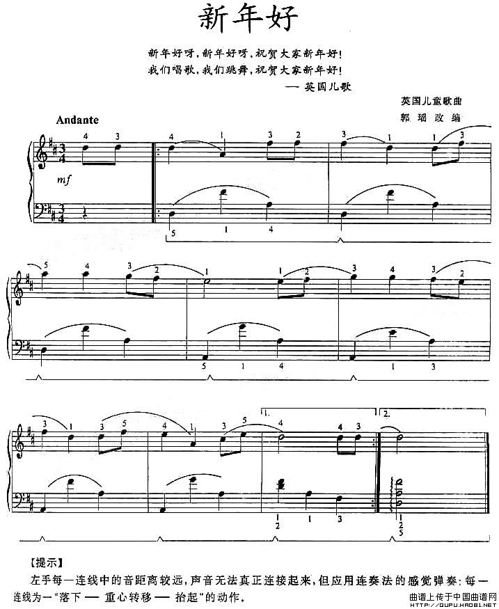 温馨提示:想要保存新年好钢琴谱,欢乐迎新年,经典儿歌改编,洋溢喜庆氛围,传递美好祝愿曲谱?在曲谱图片上单击右键,选择"图片另存为...",即可将该曲谱保存到您的电脑本地,想要打印出来?将图片插入到WORD中,调整合适到大小打印即可。