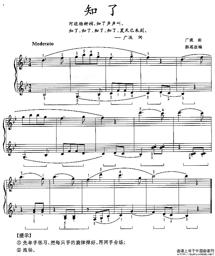 温馨提示:想要保存《知了》钢琴谱,夏日蝉鸣的旋律曲谱?在曲谱图片上单击右键,选择"图片另存为...",即可将该曲谱保存到您的电脑本地,想要打印出来?将图片插入到WORD中,调整合适到大小打印即可。