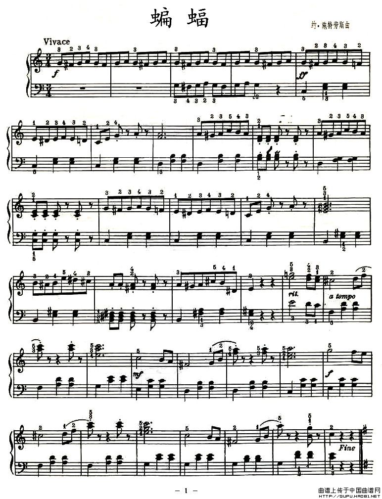 温馨提示:想要保存《蝙蝠》钢琴谱,歌剧序曲的经典之作曲谱?在曲谱图片上单击右键,选择"图片另存为...",即可将该曲谱保存到您的电脑本地,想要打印出来?将图片插入到WORD中,调整合适到大小打印即可。