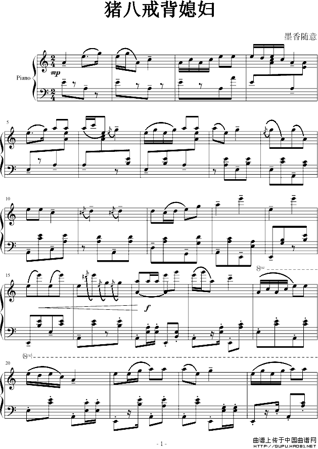 温馨提示:想要保存《猪八戒背媳妇》钢琴谱,经典欢快的旋律曲谱?在曲谱图片上单击右键,选择"图片另存为...",即可将该曲谱保存到您的电脑本地,想要打印出来?将图片插入到WORD中,调整合适到大小打印即可。