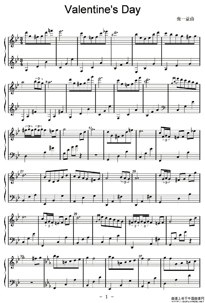 温馨提示:想要保存《Valentine'sDay(情人节)》钢琴谱,浪漫情人节专属曲曲谱?在曲谱图片上单击右键,选择"图片另存为...",即可将该曲谱保存到您的电脑本地,想要打印出来?将图片插入到WORD中,调整合适到大小打印即可。