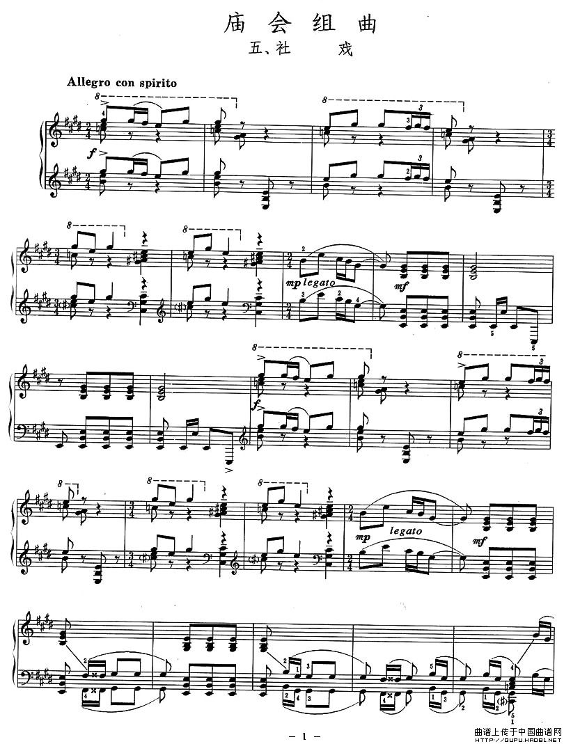 温馨提示:想要保存庙会组曲:五、社戏,展现传统庙会风情曲谱?在曲谱图片上单击右键,选择"图片另存为...",即可将该曲谱保存到您的电脑本地,想要打印出来?将图片插入到WORD中,调整合适到大小打印即可。
