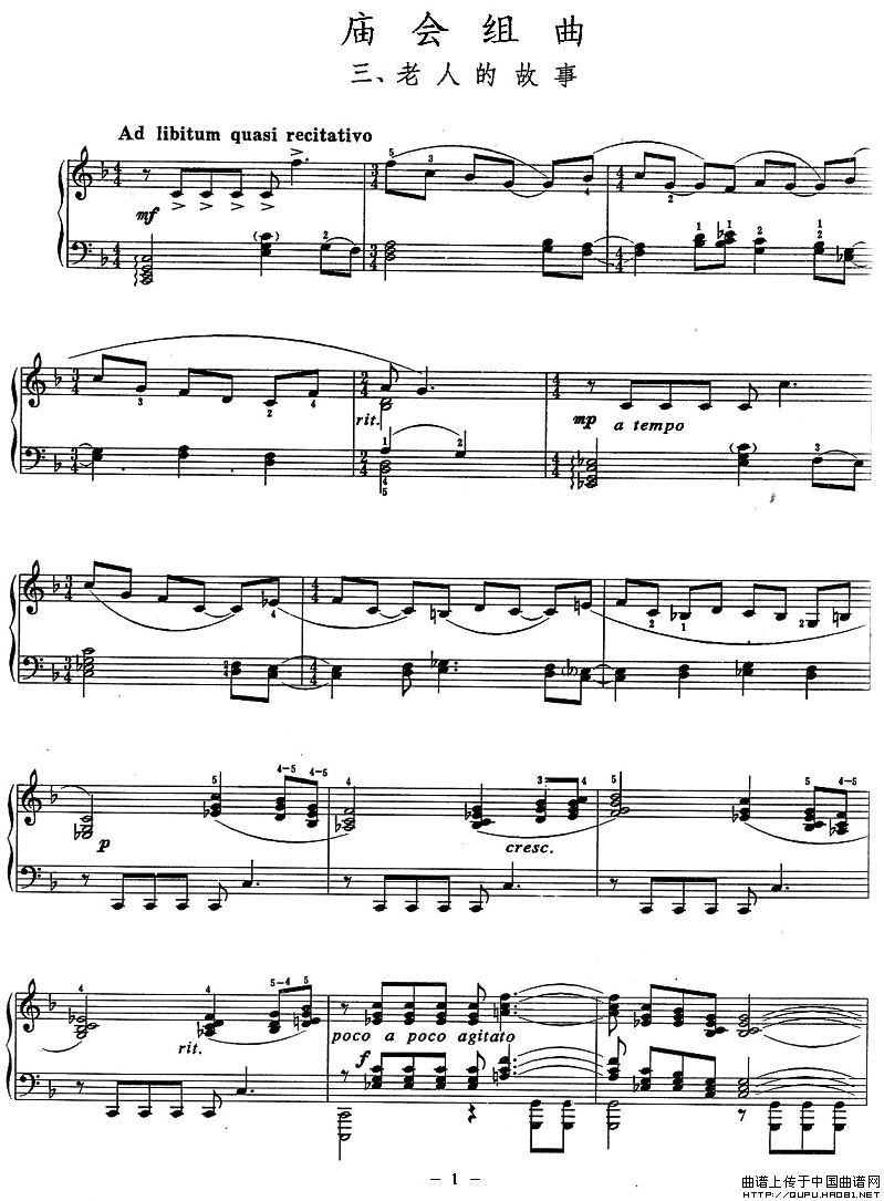 温馨提示:想要保存庙会组曲:三、老人的故事,讲述岁月沧桑故事 曲谱?在曲谱图片上单击右键,选择"图片另存为...",即可将该曲谱保存到您的电脑本地,想要打印出来?将图片插入到WORD中,调整合适到大小打印即可。