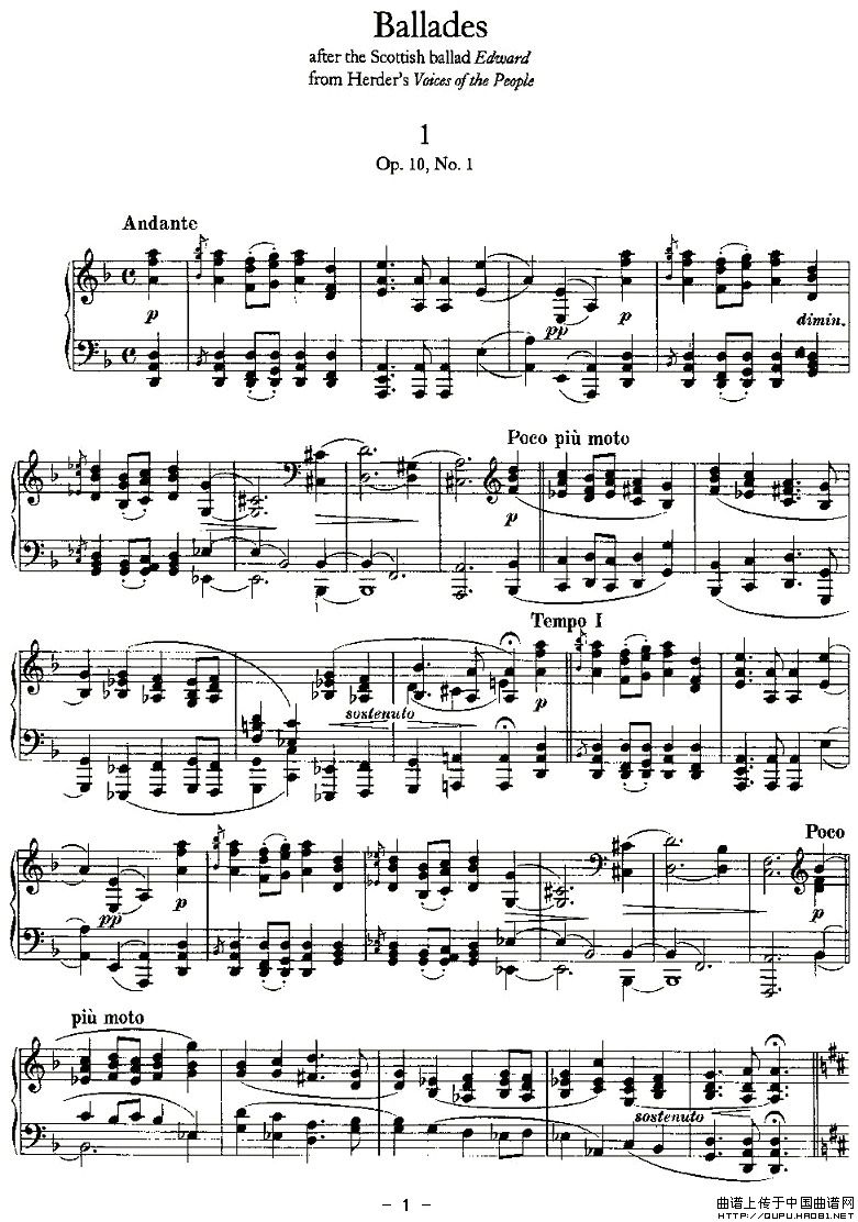 温馨提示:想要保存Ballades勃拉姆斯叙事曲,诉说动人音乐故事曲谱?在曲谱图片上单击右键,选择"图片另存为...",即可将该曲谱保存到您的电脑本地,想要打印出来?将图片插入到WORD中,调整合适到大小打印即可。