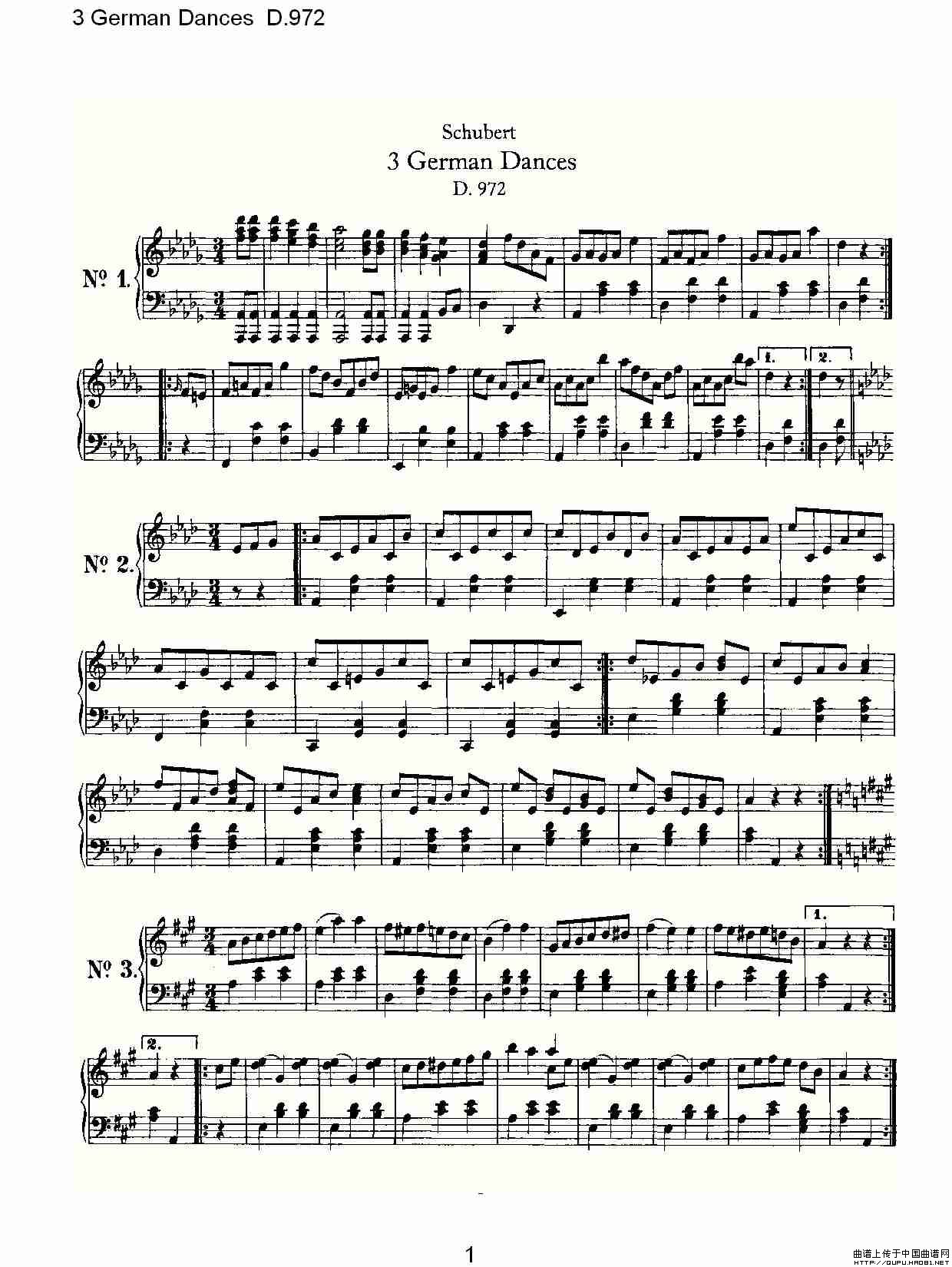 温馨提示:想要保存3德国舞曲D.972钢琴谱,经典德舞旋律悠扬曲谱?在曲谱图片上单击右键,选择"图片另存为...",即可将该曲谱保存到您的电脑本地,想要打印出来?将图片插入到WORD中,调整合适到大小打印即可。
