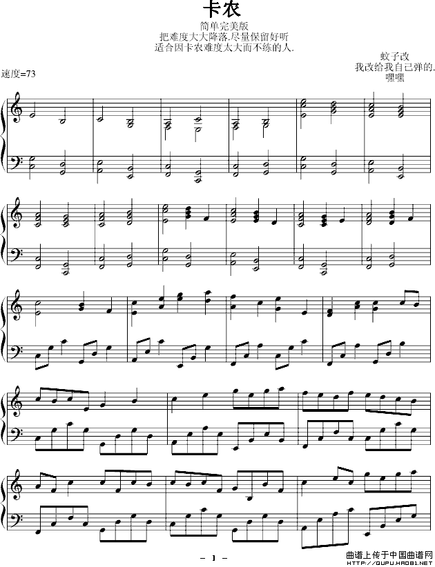 温馨提示:想要保存卡农(完美简单版)钢琴谱,经典旋律超迷人 卡农(完美简单版)钢琴谱,简单呈现经典韵 卡农(完美简单版)钢琴谱,感受别样音乐情曲谱?在曲谱图片上单击右键,选择"图片另存为...",即可将该曲谱保存到您的电脑本地,想要打印出来?将图片插入到WORD中,调整合适到大小打印即可。