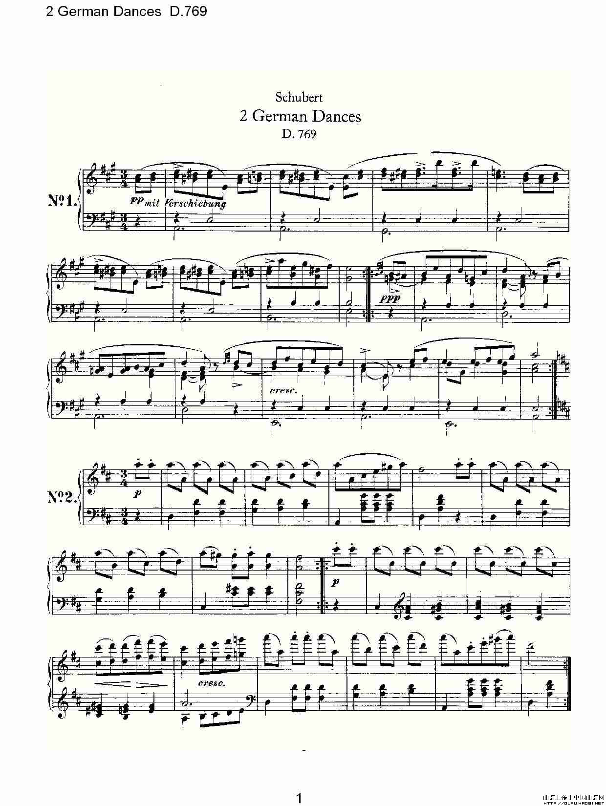 温馨提示:想要保存2德国舞曲D.769钢琴谱,经典德舞旋律悠扬曲谱?在曲谱图片上单击右键,选择"图片另存为...",即可将该曲谱保存到您的电脑本地,想要打印出来?将图片插入到WORD中,调整合适到大小打印即可。