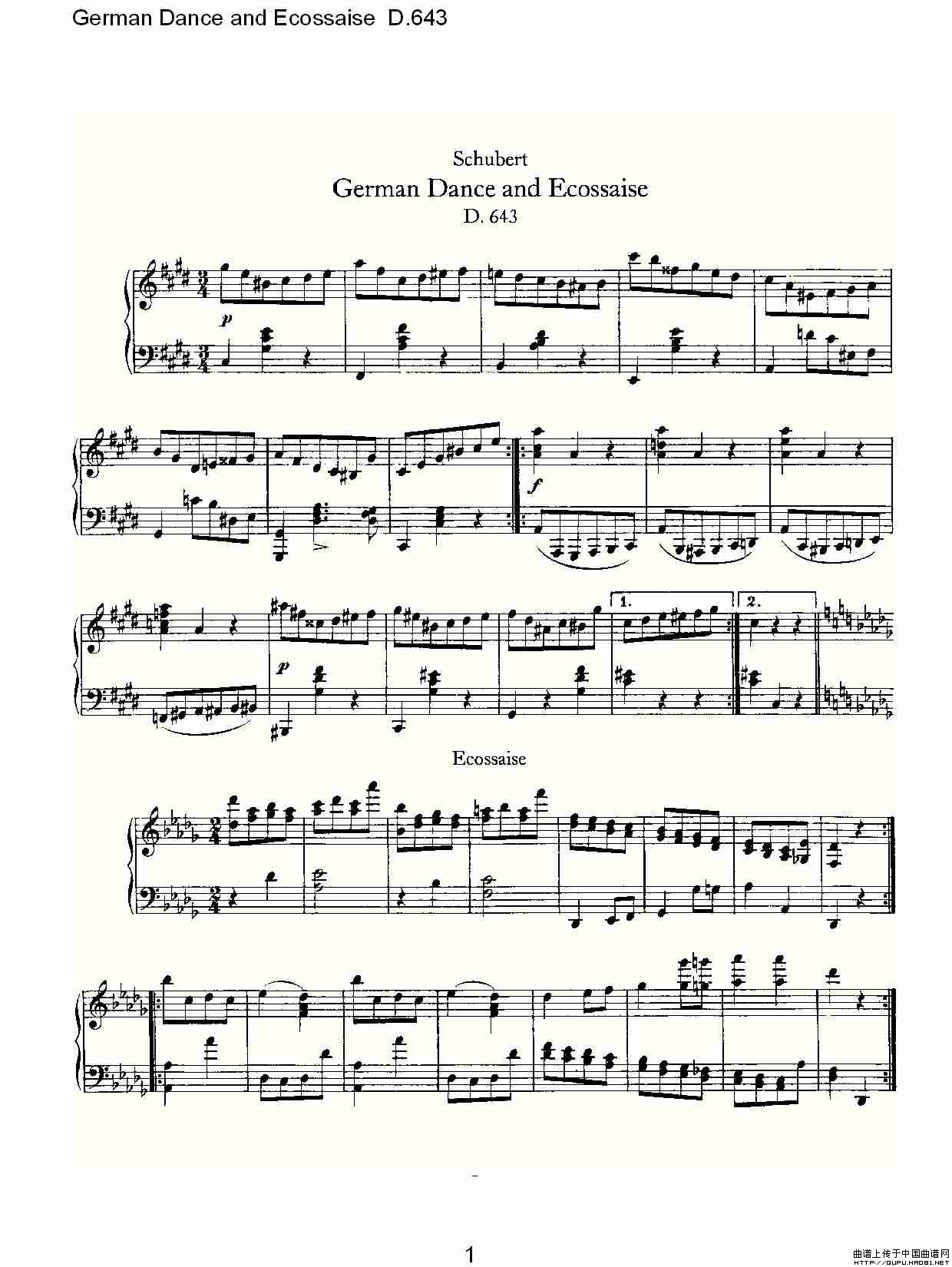 温馨提示:想要保存GermanDanceandEcossaiseD.643钢琴谱,展现独特音乐魅力曲谱?在曲谱图片上单击右键,选择"图片另存为...",即可将该曲谱保存到您的电脑本地,想要打印出来?将图片插入到WORD中,调整合适到大小打印即可。