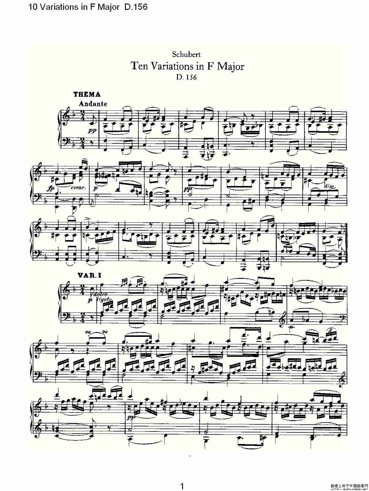 温馨提示:想要保存F大调10变奏曲D.156,经典旋律韵味足曲谱?在曲谱图片上单击右键,选择"图片另存为...",即可将该曲谱保存到您的电脑本地,想要打印出来?将图片插入到WORD中,调整合适到大小打印即可。