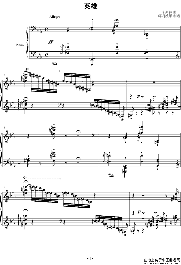 温馨提示:想要保存《英雄》钢琴谱,展现英雄豪迈气概曲谱?在曲谱图片上单击右键,选择"图片另存为...",即可将该曲谱保存到您的电脑本地,想要打印出来?将图片插入到WORD中,调整合适到大小打印即可。