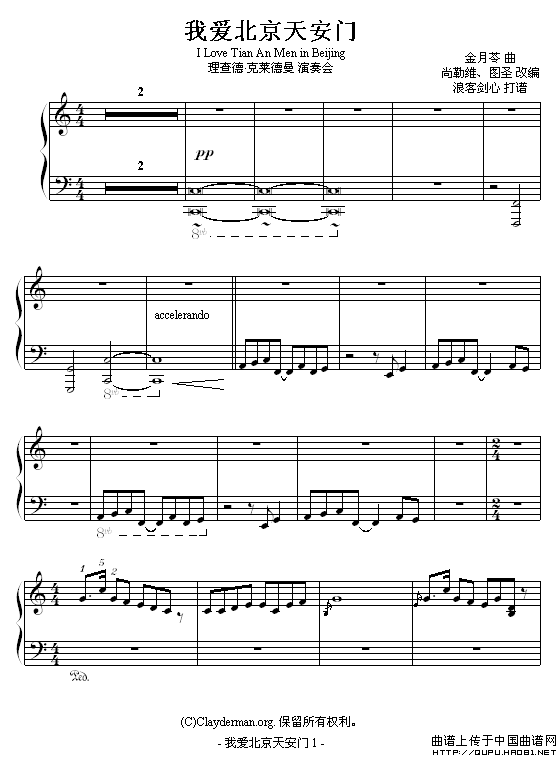 温馨提示:想要保存我爱北京天安门钢琴谱,经典红歌永流传 《我和我的祖国》钢琴谱 我和我的祖国钢琴谱,深情颂祖国之爱 《茉莉花》钢琴谱 茉莉花钢琴谱,芬芳民歌韵味长 《小星星》钢琴谱 小星星钢琴谱,童真旋律暖人心 曲谱?在曲谱图片上单击右键,选择"图片另存为...",即可将该曲谱保存到您的电脑本地,想要打印出来?将图片插入到WORD中,调整合适到大小打印即可。