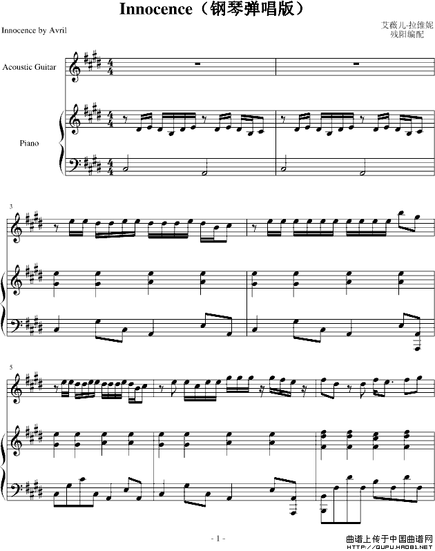 温馨提示:想要保存Innocence钢琴谱,青春纯真的旋律曲谱?在曲谱图片上单击右键,选择"图片另存为...",即可将该曲谱保存到您的电脑本地,想要打印出来?将图片插入到WORD中,调整合适到大小打印即可。