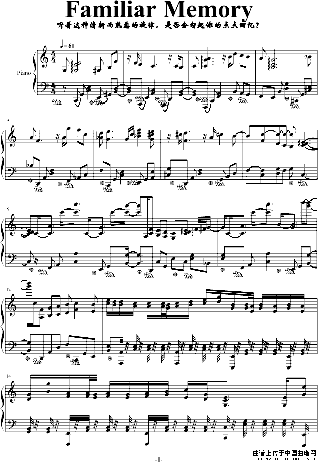 温馨提示:想要保存FamiliarMemory钢琴谱,熟悉记忆的旋律曲谱?在曲谱图片上单击右键,选择"图片另存为...",即可将该曲谱保存到您的电脑本地,想要打印出来?将图片插入到WORD中,调整合适到大小打印即可。