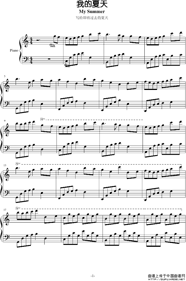 温馨提示:想要保存我的夏天钢琴谱,轻快旋律展活力曲谱?在曲谱图片上单击右键,选择"图片另存为...",即可将该曲谱保存到您的电脑本地,想要打印出来?将图片插入到WORD中,调整合适到大小打印即可。