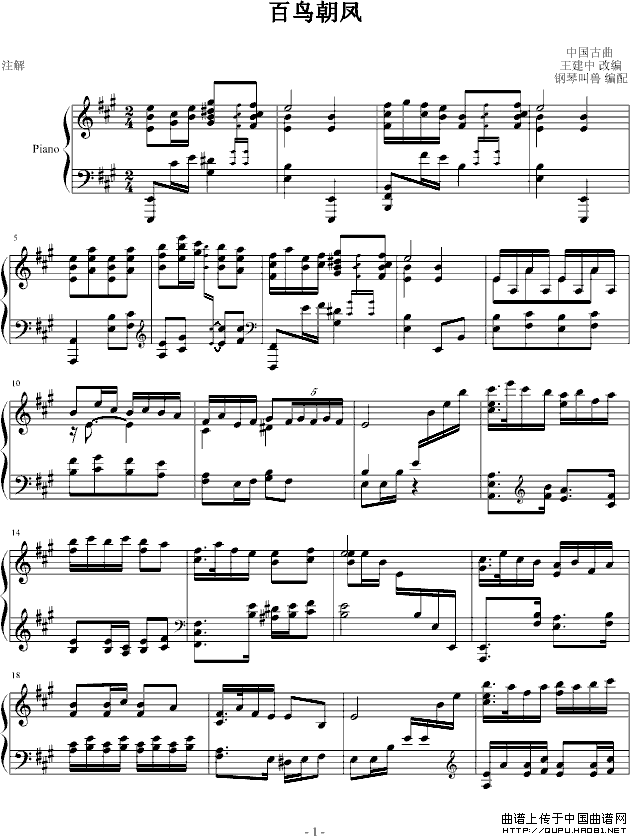 温馨提示:想要保存百鸟朝凤钢琴谱,经典民族风旋律曲谱?在曲谱图片上单击右键,选择"图片另存为...",即可将该曲谱保存到您的电脑本地,想要打印出来?将图片插入到WORD中,调整合适到大小打印即可。