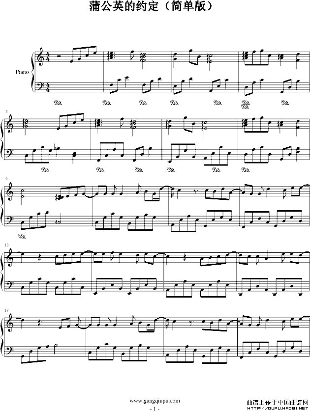 温馨提示:想要保存蒲公英的约定,回忆青涩的爱情 《菊花台》钢琴谱,勾勒凄美画面 《青花瓷》钢琴谱,描绘古典浪漫 《简单爱》钢琴谱,传递纯真爱意 《东风破》钢琴谱,尽显古风韵味曲谱?在曲谱图片上单击右键,选择"图片另存为...",即可将该曲谱保存到您的电脑本地,想要打印出来?将图片插入到WORD中,调整合适到大小打印即可。