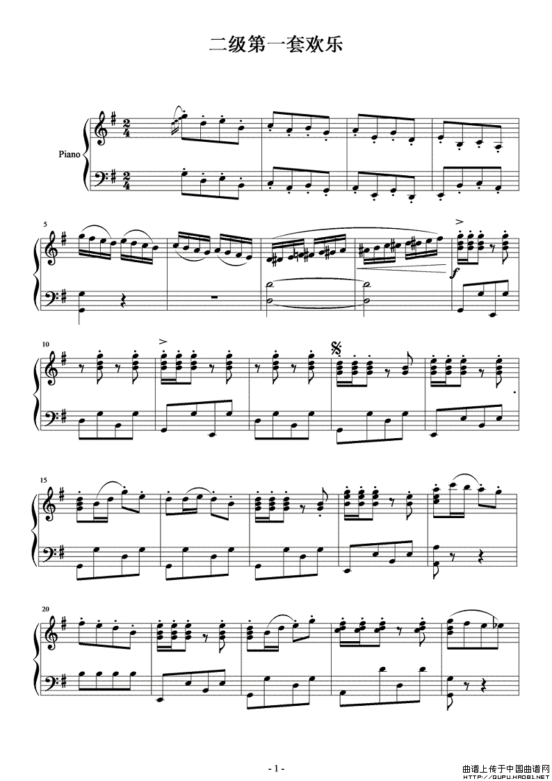 温馨提示:想要保存《二级第一套欢乐》钢琴谱,展现欢快音乐氛围曲谱?在曲谱图片上单击右键,选择"图片另存为...",即可将该曲谱保存到您的电脑本地,想要打印出来?将图片插入到WORD中,调整合适到大小打印即可。