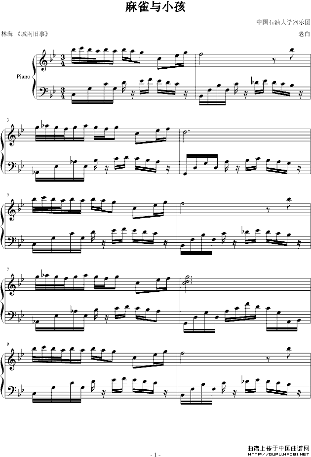 温馨提示:想要保存《麻雀与小孩》钢琴谱,展现纯真童趣故事曲谱?在曲谱图片上单击右键,选择"图片另存为...",即可将该曲谱保存到您的电脑本地,想要打印出来?将图片插入到WORD中,调整合适到大小打印即可。