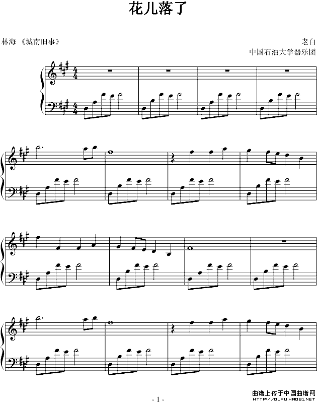 温馨提示:想要保存花儿落了,叹时光匆匆,花儿落了,感岁月变迁,花儿落了,绘生命轮回曲谱?在曲谱图片上单击右键,选择"图片另存为...",即可将该曲谱保存到您的电脑本地,想要打印出来?将图片插入到WORD中,调整合适到大小打印即可。