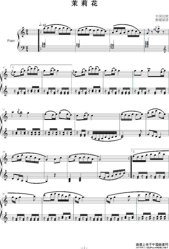 温馨提示:想要保存《茉莉花(4个版本)》钢琴谱,展现多样茉莉风情曲谱?在曲谱图片上单击右键,选择"图片另存为...",即可将该曲谱保存到您的电脑本地,想要打印出来?将图片插入到WORD中,调整合适到大小打印即可。
