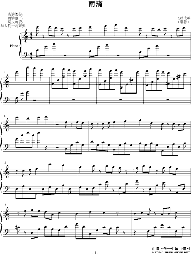 温馨提示:想要保存雨滴飞丝改编版钢琴谱,独特改编韵味足 雨滴飞丝改编钢琴谱,展现别样的旋律 雨滴飞丝版钢琴乐谱,诠释别样的雨滴曲谱?在曲谱图片上单击右键,选择"图片另存为...",即可将该曲谱保存到您的电脑本地,想要打印出来?将图片插入到WORD中,调整合适到大小打印即可。