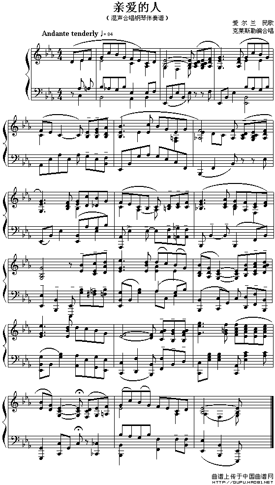 温馨提示:想要保存亲爱的人(爱尔兰),诉说动人情感, 亲爱的人(爱尔兰),展现别样风情, 亲爱的人(爱尔兰),传递真挚爱意,曲谱?在曲谱图片上单击右键,选择"图片另存为...",即可将该曲谱保存到您的电脑本地,想要打印出来?将图片插入到WORD中,调整合适到大小打印即可。