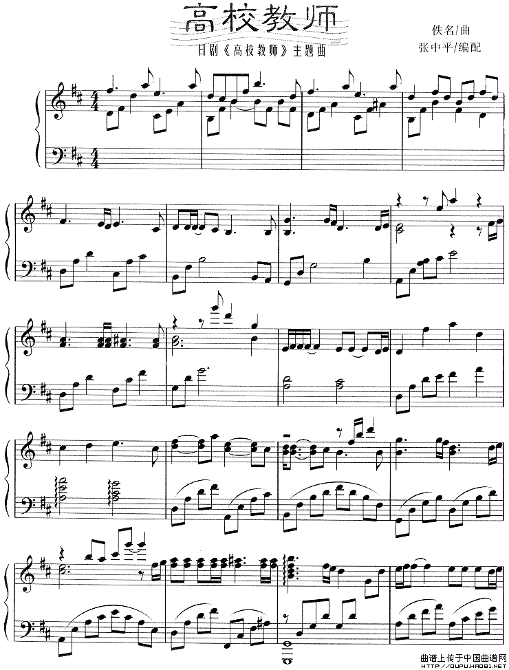 温馨提示:想要保存高校教师钢琴谱,日剧主题曲经典 高校教师钢琴谱,同名主题曲韵味 高校教师钢琴谱,动人旋律引共鸣曲谱?在曲谱图片上单击右键,选择"图片另存为...",即可将该曲谱保存到您的电脑本地,想要打印出来?将图片插入到WORD中,调整合适到大小打印即可。