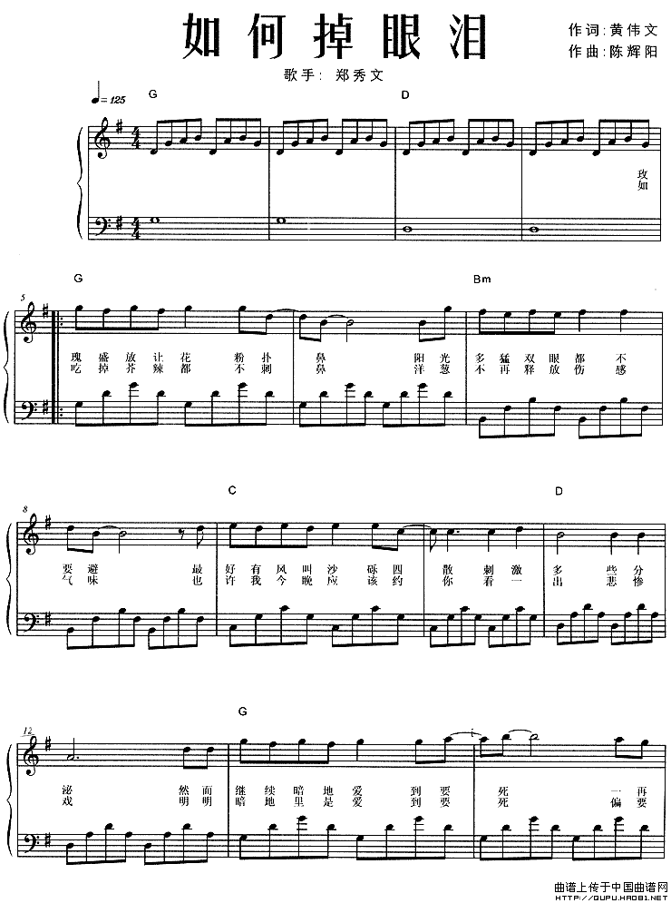 温馨提示:想要保存如何掉眼泪钢琴谱,悲伤情绪娓娓道来曲谱?在曲谱图片上单击右键,选择"图片另存为...",即可将该曲谱保存到您的电脑本地,想要打印出来?将图片插入到WORD中,调整合适到大小打印即可。