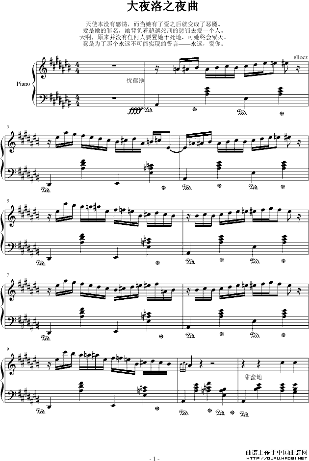 温馨提示:想要保存大夜洛之夜曲,神秘深邃的旋律曲谱?在曲谱图片上单击右键,选择"图片另存为...",即可将该曲谱保存到您的电脑本地,想要打印出来?将图片插入到WORD中,调整合适到大小打印即可。