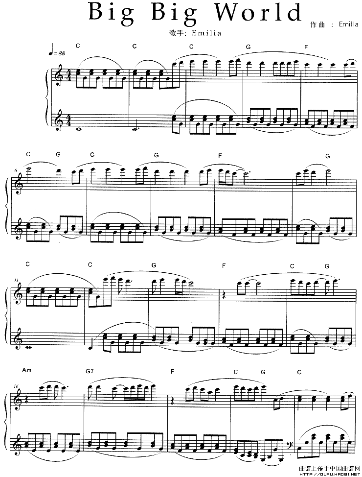 温馨提示:想要保存《BigBigWorld》钢琴谱,一首经典的英文歌曲谱?在曲谱图片上单击右键,选择"图片另存为...",即可将该曲谱保存到您的电脑本地,想要打印出来?将图片插入到WORD中,调整合适到大小打印即可。